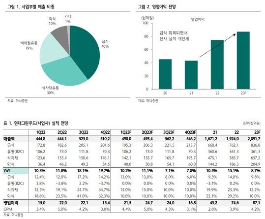 하나증권에 따르면, 올해 현대그린푸드의 매출액과 영업이익은 각각 전년 대비 8.7% 성장한 2조 917억원과 16.7% 늘어난 871억원으로 추정된다. 매출 비중은 급식 40%, 식자재유통 30%, 백화점유통 19%, 외식 10%이다.