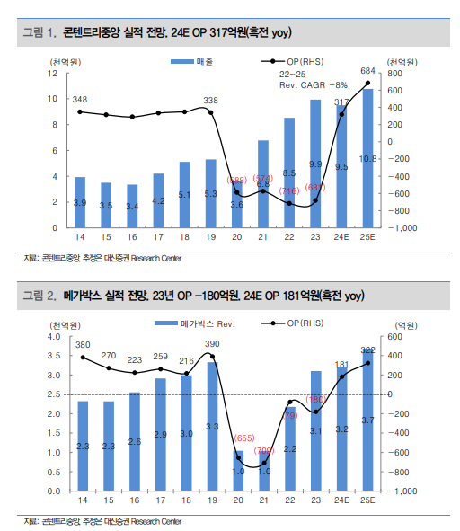 대신증권에 따르면, 콘텐트리중앙의 실적은 올해 5년 만의 흑자 달성이 전망되며, 영업이익은 317억 원으로 추정된다.