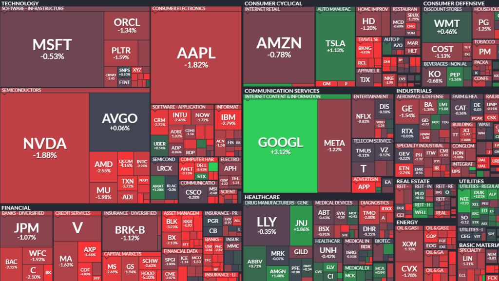 뉴욕증권거래소에서 다우지수는 전 거래일보다 1.18% 하락한 4만6590.24를 기록했습니다. S&P500지수는 0.92% 하락한 6672.41로, 기술주 중심의 나스닥지수는 0.84% 떨어진 2만2708.07로 장을 마감했습니다.
