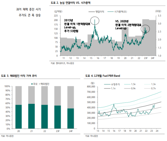 이어 "2015년 농심의 연결이익이 1천억원을 돌파했을 때 주가는 52만원까지 슈팅했다"며 "올해 농심은 연결이익 2천억원을 돌파할 것으로 추정되며 3분기 실적은 다소 슬로우 하겠지만, 전반적인 체력 증진과 해외 이익 기여가 50%까지 확대되었다는 점이 긍정적"이라고 평가했다. 이에 조정시마다 매수 관점을 유지했다.