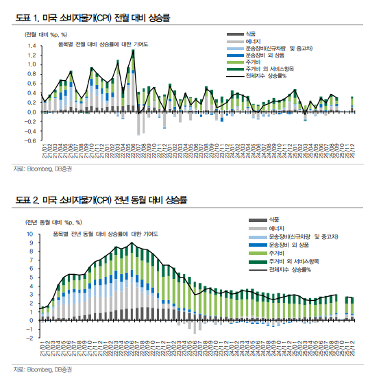 DB증권에 따르면, 12월 미국 근원 소비자물가 상승률은 월간 0.24%로 컨센서스 0.3% 밑돌았다. 전월 대비 헤드라인 지수 상승률은 컨센서스에 부합하는 0.31%를 기록했고 근원지수 상승률은 시장 전망치보다 낮은 0.24%를 기록했다.