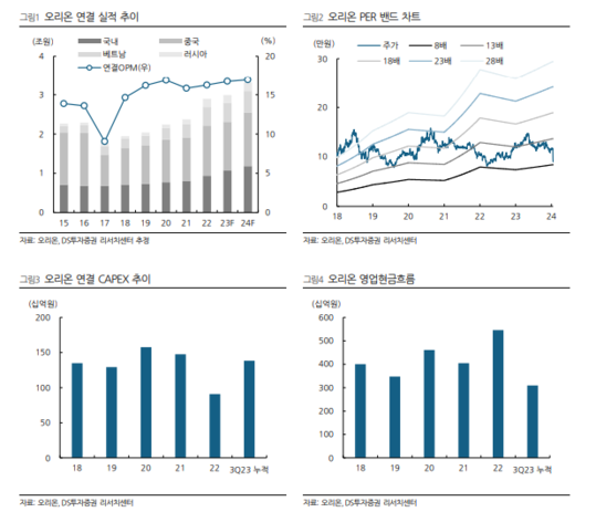 현재 오리온의 24개월 선행 주가수익비율(PER)은 9배에 불과하며 음식료 경쟁사들과 비교해 본업 개선만으로도 상승 여력이 높다는 분석이다.