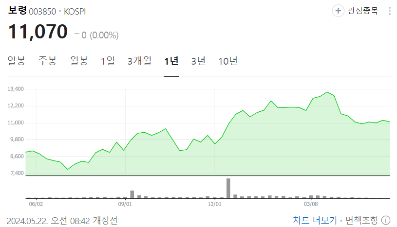 보령의 주가는 2023년에 크게 상승했다. 2023년 상반기 8000원대에서 카나브패밀리 성장지속과 케이캡 상품매출 계약으로 2024년 3월 1만3000원대까지 상승했다. 그 이후 의료파업과 금리인하 분위기 퇴조 등으로 하락, 현재 1만1000원내외에서 등락 중이다.