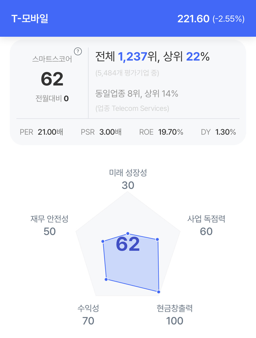 T-모바일 주가는 221.60달러로 2.55% 하락 후 마감했다.