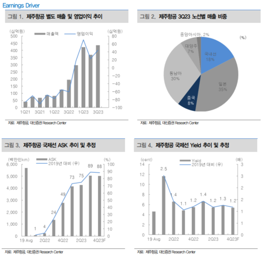 양지환 대신증권 연구원은 "일본과 동남아 노선의 견조한 수요 지속, 4분기 여객기 2대, 화물기 1대 도입에 따른 사업량 증가 견조한 수요에 기반한 국제여객 Yield상승이 4분기 호실적의 배경"이라고 설명했다.