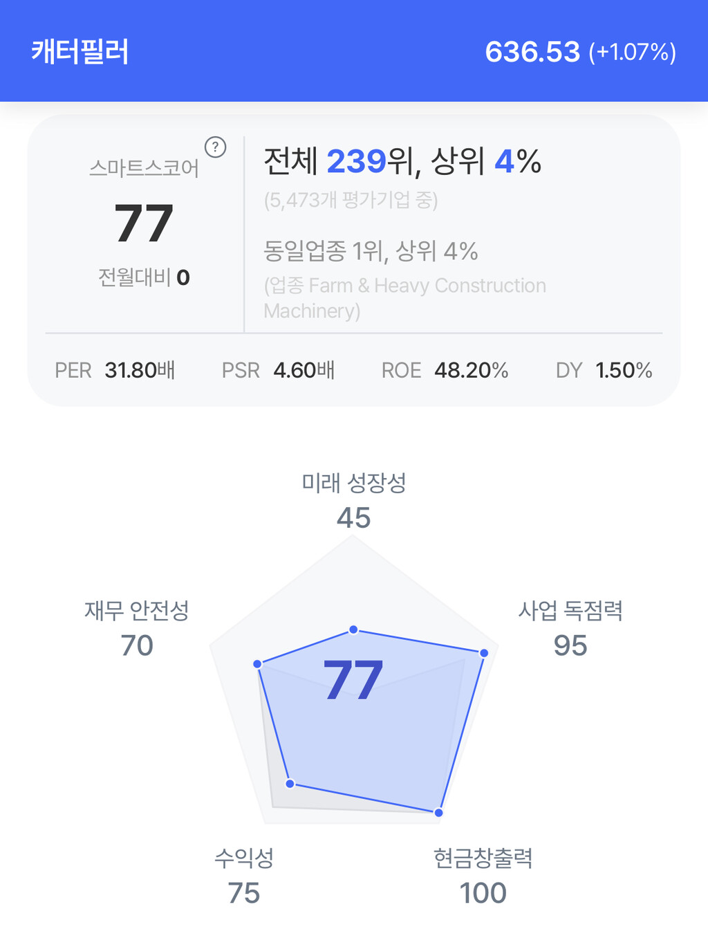 캐터필러 주가는 13일(현지시간) 장중 한때 2.4% 오른 644.59 달러까지 상승했다. 올해 들어 주가는 12% 상승했으며, S&P500 산업재 지수 내에서도 상승률 상위 종목에 이름을 올렸다.