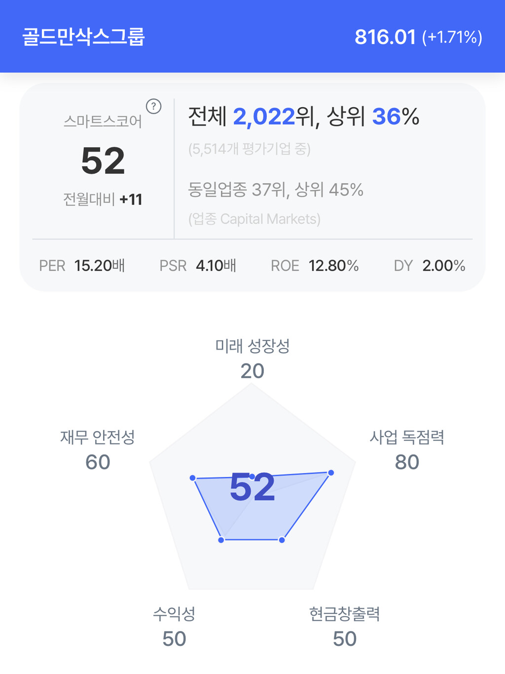골드만삭스 주가는 1.71% 상승한 816.01달러를 기록했다.