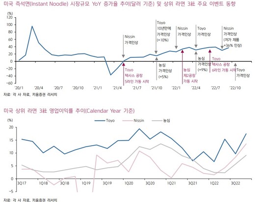 박상준 키움증권 연구원은 "작년부터 미국 내 물가 상승이 심화되면서, 가성비 매력이 높은 라면 제품에 대한 수요가 구조적으로 개선되고 있다"며 "중기적으로 가격 인상, 판매량 증가, 원재료 단가 안정화 등에 힘입어 국내와 북미 법인을 중심으로 큰 폭의 실적 개선이