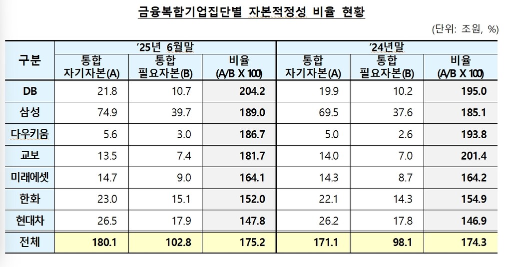 20일 금융감독원에 따르면 DB, 삼성, 다우키움, 교보, 미래에셋, 한화, 현대차 등 7개 금융복합기업집단의 자본적정성 비율은 175.2%로 전년 말(174.3%) 대비 0.9%포인트 상승했다.