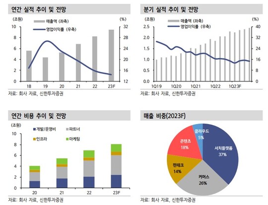 강석오 신한투자증권 연구원은 "경기침체로 캐시카우 사업부인 광고 및 커머스는 성장이 둔화되고, 외형성장은 나타나지만 상대적으로 수익성이 낮은 콘텐츠,클라우드 사업은 전사 영업이익률을 떨어뜨린다"며 " 매출 믹스 변화의 과정에 있으며, 이번 분기부터 연결 인식될 포시마크의 적자도 영향을 미쳤다"고 분석했다.
