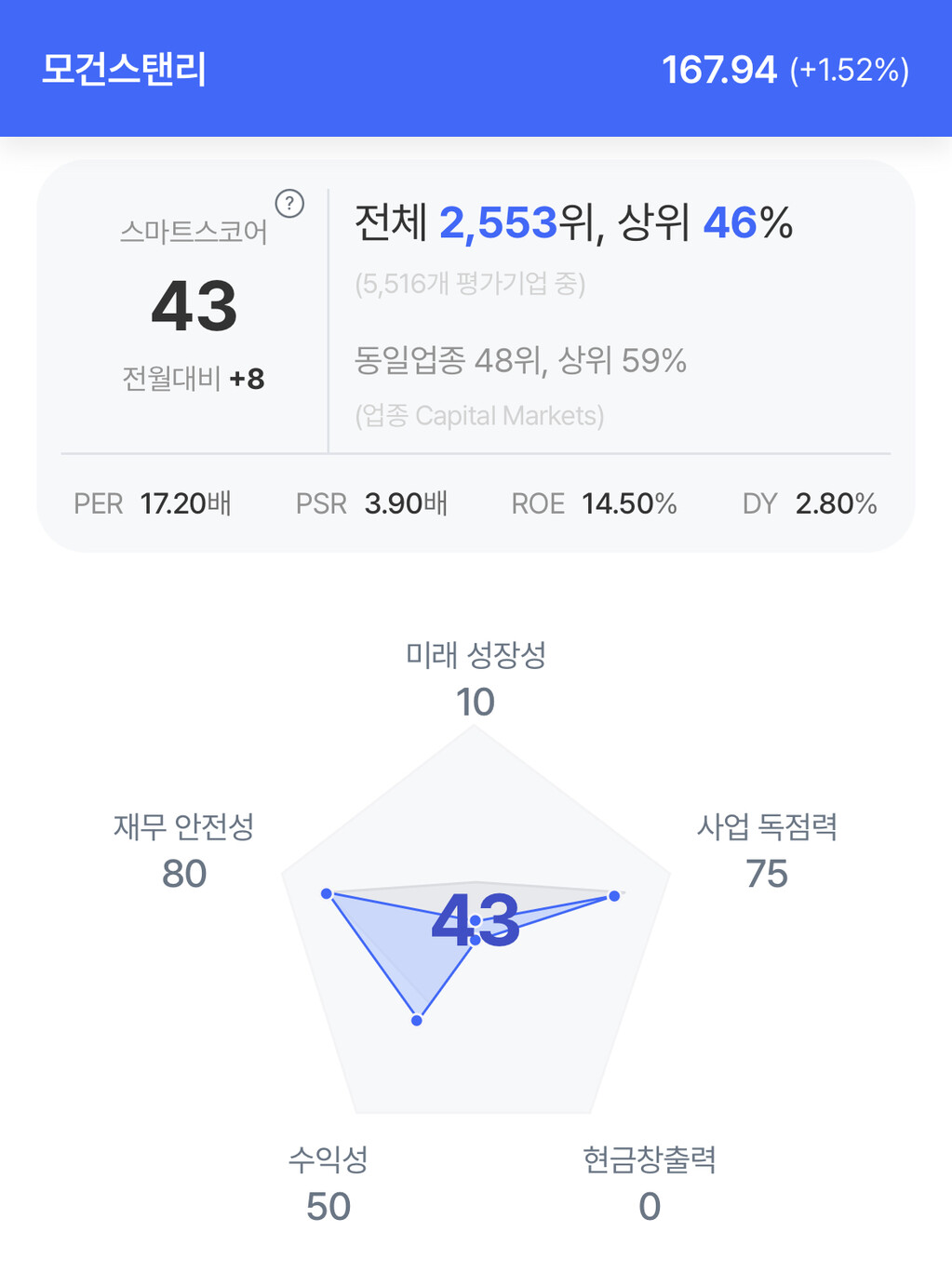 모건스탠리 주가는 1.52% 상승한 167.94 달러로 마감했다.