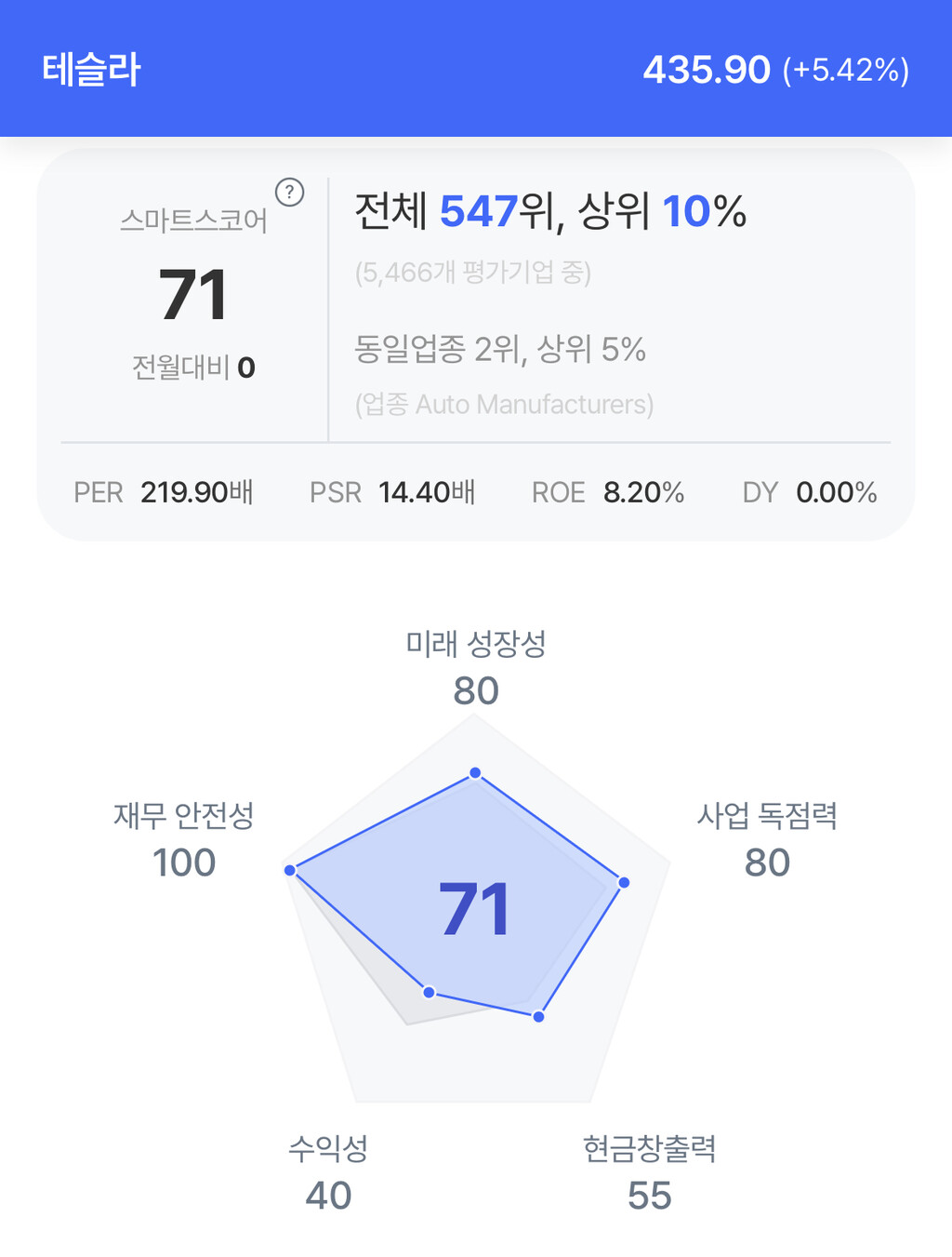 테슬라 주가는 5.42% 상승 후 435.90달러로 마감했다.
