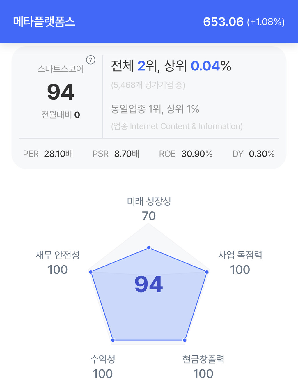메타 주가는 1.08% 상승한 653.06 달러를 기록했다.