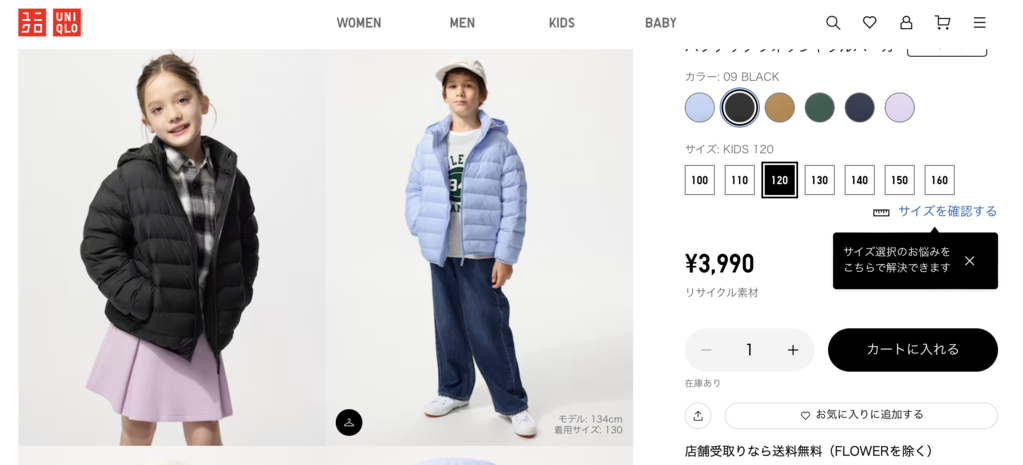 세 번째 요인은 경제성이다. 키즈 다운의 가격은 3990엔으로 성인용보다 3000~4000엔 저렴하다. 어린이용 사이즈는 100~160cm로 전개되어 체구가 작은 성인도 충분히 착용할 수 있다. 색상도 6가지로 다양하며, 라이트블루나 퍼플 등 성인용보다 밝은 색상도 많다.