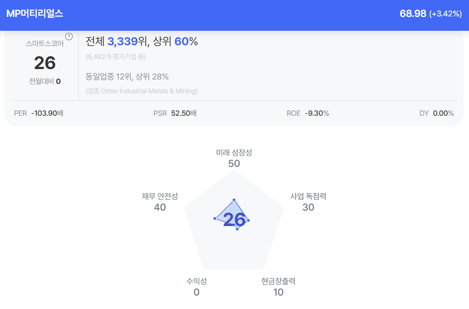 | MP머티리얼스 종목진단 (출처=초이스스탁) |