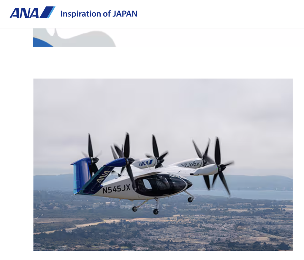 ANA 홀딩스는 2022년 조비와 제휴를 맺은 후 올해 8월 합작사 설립을 위한 각서를 체결했다. 조비의 'S4'는 최대 시속 320㎞, 항속거리 160㎞의 성능을 자랑한다. 도요타자동차가 출자한 조비는 미국 연방항공국(FAA) 형식증명 심사에서 5단계 중 3단계를 완료했으며, 일부는 최종 단계에 진입했다. 2026년 두바이에서 세계 최초 유상 승객 운항을 시작할 계획이다.