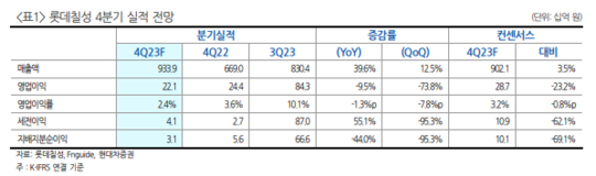 현대차증권에 따르면, 롯데칠성의 4분기 연결 기준 매출액은 9339억 원으로 전년 대비 39.6% 증가하고, 영업이익은 221억 원으로 9.4% 감소할 것으로 추정된다.