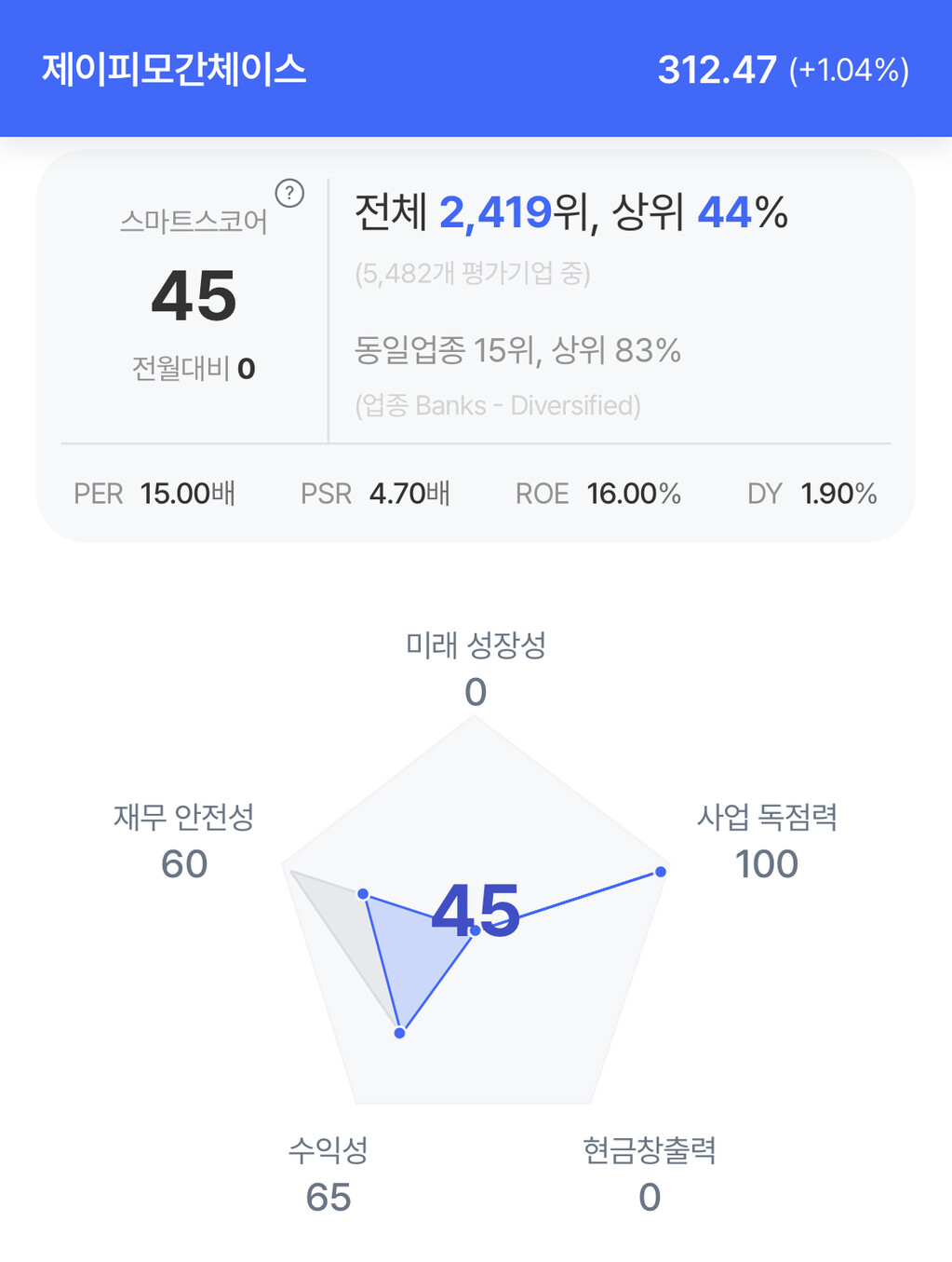 JP모건 주가는 312.47 달러로 1.04% 상승 마감했다.