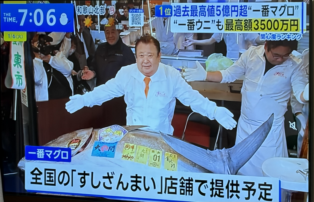 초밥집 '스시잔마이'를 운영하는 키요무라의 기무라 키요시 사장은 아오모리현 오마산 참다랑어 243킬로그램을 5억 1030만 엔에 낙찰했다고 발표했다. 이는 2019년 회사가 기록한 종전 최고가 3억 3360만 엔을 크게 넘어선 금액이다. 기무라 사장은 "경기가 좋아지기를 바라며 비싸지만 낙찰했다"고 밝혔다.