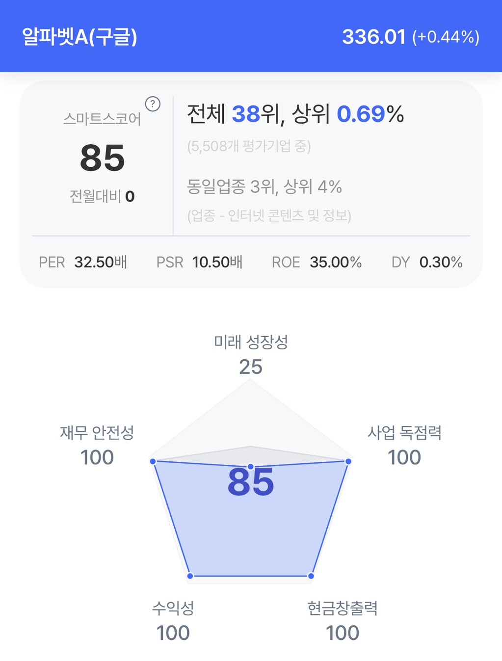 구글 주가는 0.44% 상승한 336.01달러를 기록했다.