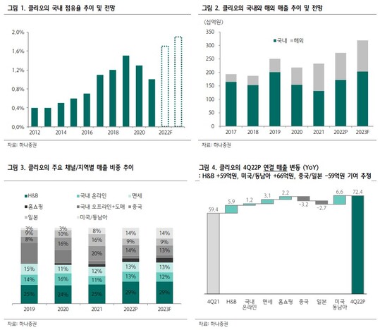 박은정 하나증권 연구원은 "중국의 리오프닝 기조, 미국과 동남아 관광객의 방한 등으로 2분기부터 내수 화장품 수요 상승이 기대된다"며 "올해 방한 외국인 트래픽은 면세와 H&B채널로 집중될 것이며, 특히 클리오의 H&B 채널에서의 독보적인 성과가 기대된다"고 판단했다. 이에 중소형주 탑픽(최선호주)과 투자의견 '매수' 그리고 목표주가 2만2000원을 유지했다.