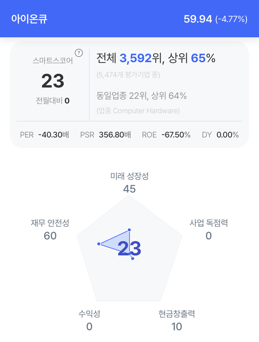 주가는 59.94달러로 4.77% 하락 마감했다.
