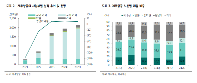 하나증권에 따르면, 제주항공의 별도 기준 2024년 2분기 매출액은 전년 동기 대비 16% 증가한 4279억 원, 영업이익은 적자전환한 -95억원을 기록하며 컨센서스를 모두 큰 폭으로 하회했다. 국제선 여객운임 하락폭이 전년 대비 6%를 기록하며 예상 대비 저조했기 때문이란 분석이다. 또한 전반적인 비용 증가도 비수기 실적에서 부각된 것으로 파악된다.