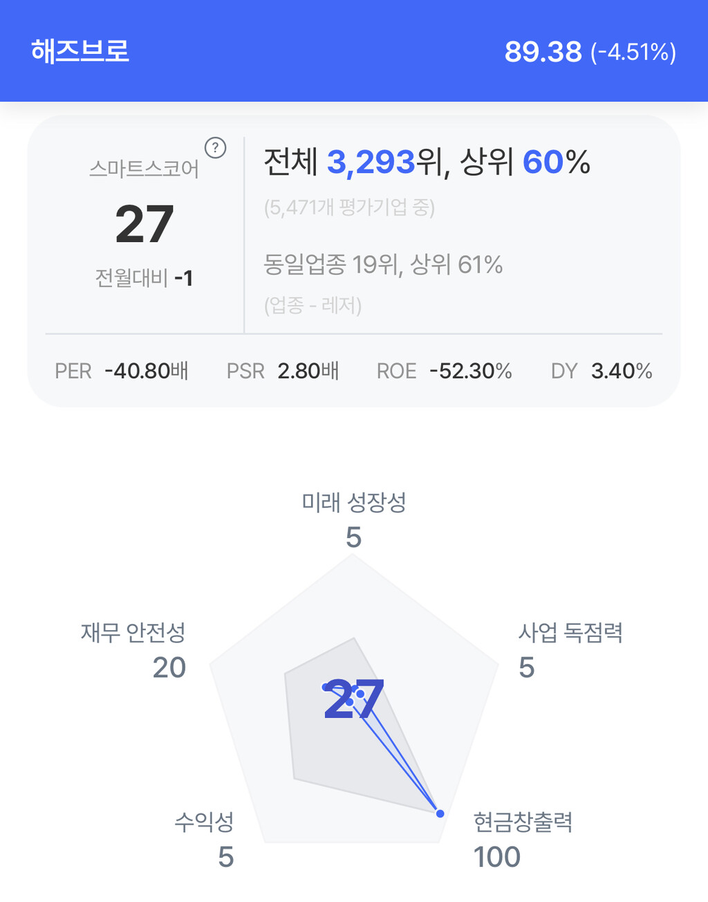 해즈브로 주가는 89.38달러로 4.51% 하락 마감했다.