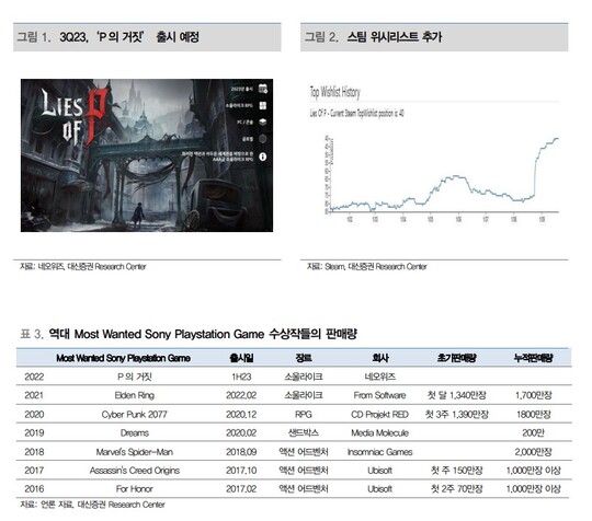 특히 올해 3분기 'P의 거짓'(스팀/콘솔)이 출시 예정인데 ' P의 거짓'은 이미 2022년 여러 게임쇼와 매체를 통해 흥행 기대감을 충분히 확인했다는 평가를 받는다.