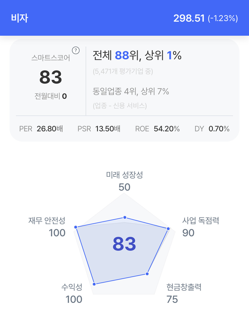 비자 주가는 298.51달러로 1.23% 하락 마감했다.