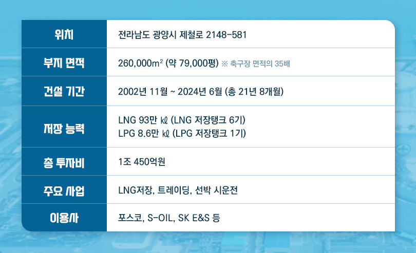 이에 함께 인접 부지에 총 9300억원을 투자해 20만㎘급 LNG탱크 2기를 증설하는 광양 제2LNG터미널도 작년 착공해 빠르게 공사 중이다.