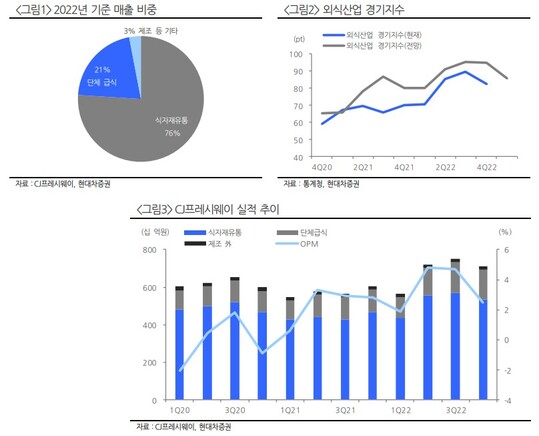 하희지 연구원은 "경기 둔화에 따른 급식 수요 확대가 기대되는 환경 속에 단체 급식 수주 확대와 실적 성장의 흐름을 이어갈 것으로 전망된다"며 "과거와 달리 수익성 위주의 경영을 지속하며 이익 체력 지속적으로 개선되고 있는 점과 2023년 1월 회사채 700억원 상환하며 올해 재무구조 개선에도 적극적인 모습도 긍정적인 요인"으로 분석했다.