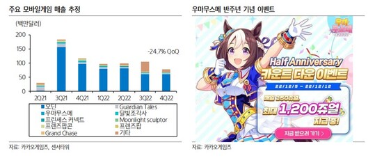 오동환 삼성증권 연구원은 "이는 마차시위 등으로 이용자 이탈이 나타났던 우마무스메의 매출 감소와 신작 출시 부재로 모바일게임 매출이 전분기보다 23% 감소했기 때문"이라고 분석했다.