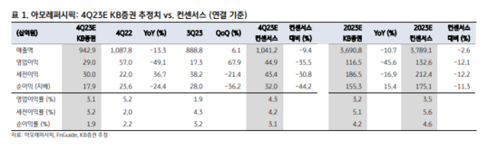 KB증권에 따르면, 아모레퍼시픽의 4분기 연결 매출액은 9429억원으로 전년 대비 13% 감소하고, 영업이익은 290억원으로 49% 줄어 매출액과 영업이익이 컨센서스를 각각 9%, 36% 하회할 것으로 추정된다. 중국 법인의 영업적자은 245억원으로 전망된다.