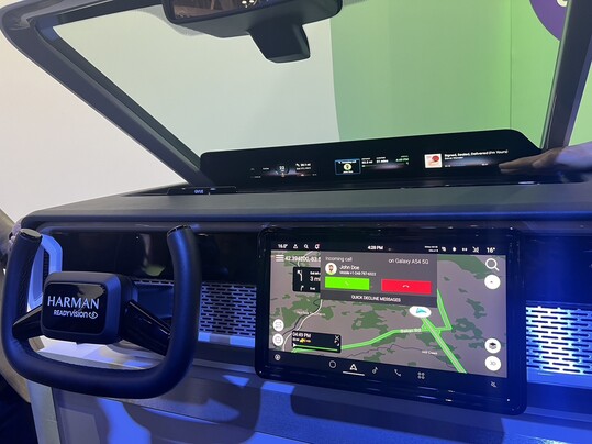 올해 처음 선보인 '레디 비전 큐뷰 (Ready Vision QVUE)'는 삼성 Neo QLED 디스플레이를 활용해 전면 윈드쉴드(Windshield) 하단 전체를 이용할 수 있다.