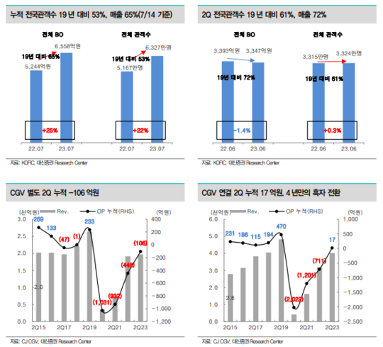 대신증권에 따르면, 올해 연간 관객수 1.5억명으로 2019년의 65%, 내년 연간 관객수 1.6억명으로 2019년의 71%를 회복할 수 있을 것으로 추정된다.