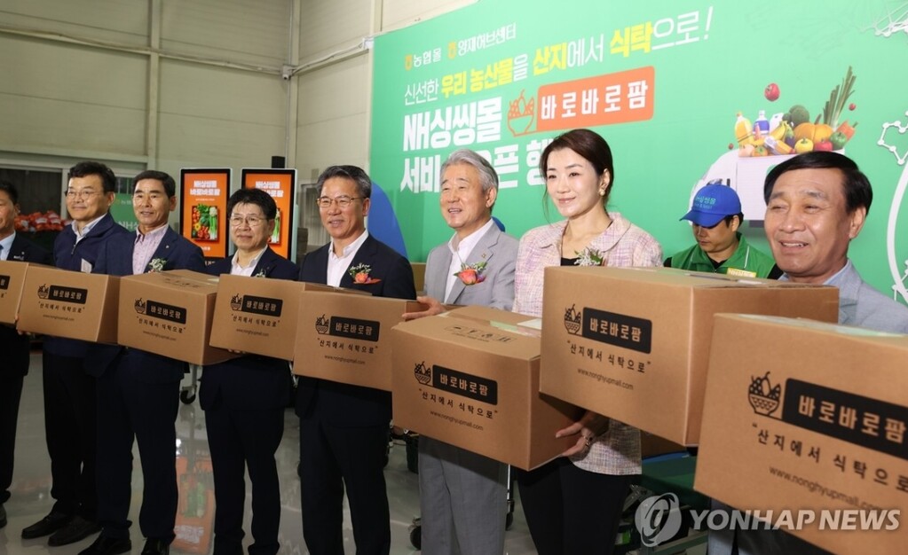 | 왼쪽 네 번째부터 박서홍 농업경제대표이사, 강호동 농협중앙회장, 조현민 한진 사장. (사진=연합뉴스) |