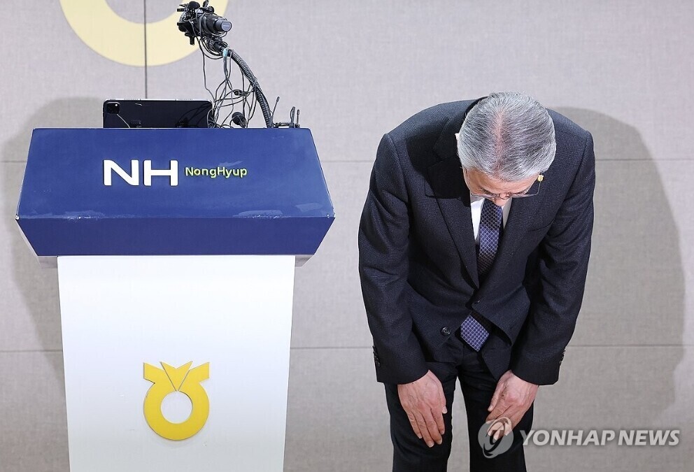 | 강호동 농협중앙회장이 13일 서울 중구 농협중앙회에서 농림축산식품부가 지난 8일 발표한 농협중앙회에 대한 특별감사 중간 결과와 관련해 대국민 사과문을 발표 하던 중 고개를 숙이고 있다. (사진=연합뉴스) |