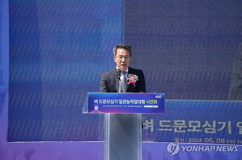 | 2024년 5월 9일 전북 김제에서 열린 '벼 드문모심기 일관농작업대행 시연회'에서 박서홍 농협경제지주 농업경제대표이사가 인사말하고 있다. (사진=연합뉴스) |