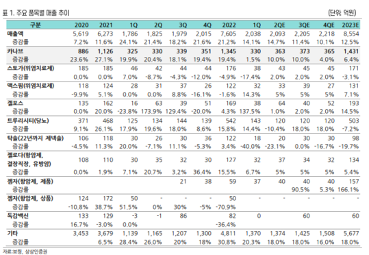 제약업계의 엔데믹효과로 전문의약품 중심으로 매출이 고성장 중이며, 특히 고마진 카나브패밀리 성장으로 영업이익이 증가하는 분위기로 영업이익 절대치는 증가하고 있으나 상품비중 증가로 영업이익률 개선은 더딘 상황이라는 평가다.