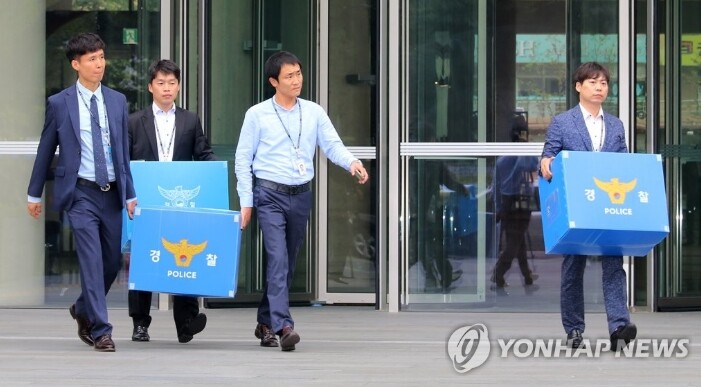 | 2017년 9월 5일 대구시 북구 칠성동 대구은행 제2본점을 압수수색한 대구지방경찰청 관계자들이 압수한 자료를 차량으로 옮기고 있다. (사진=연합뉴스) |