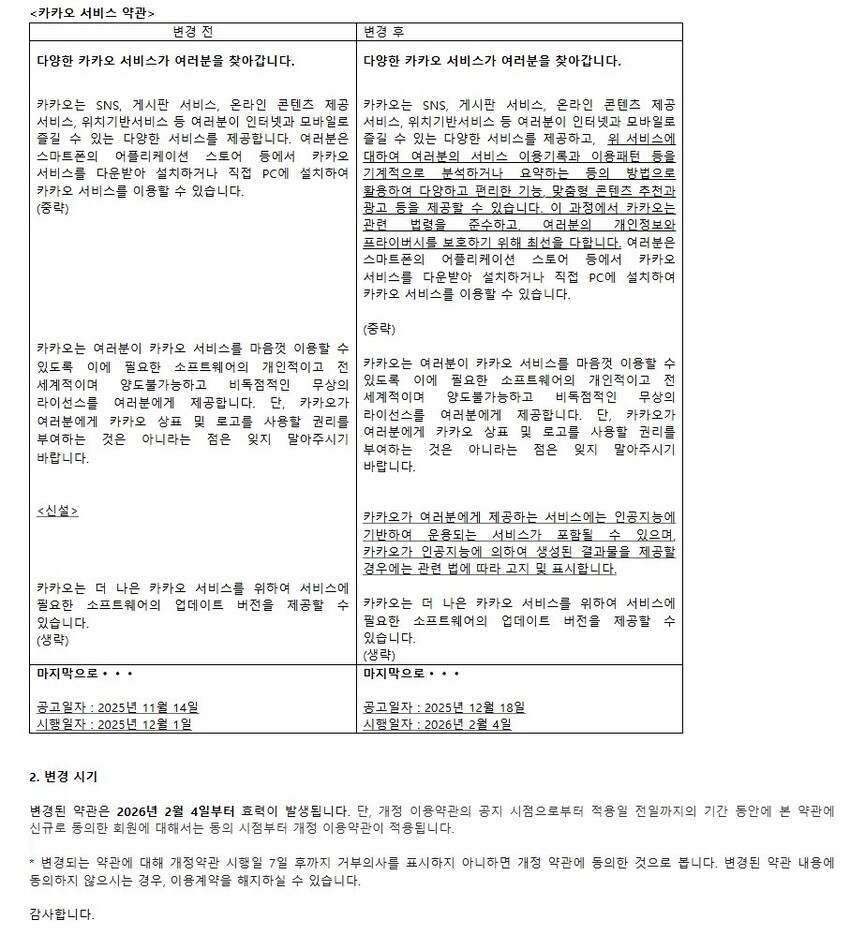 카카오는 "개정 약관 시행일로부터 7일 이내에 거부 의사를 표시하지 않으면 동의한 것으로 간주하며, 동의하지 않을 경우 이용 계약 해지가 가능하다"고 공지했다.