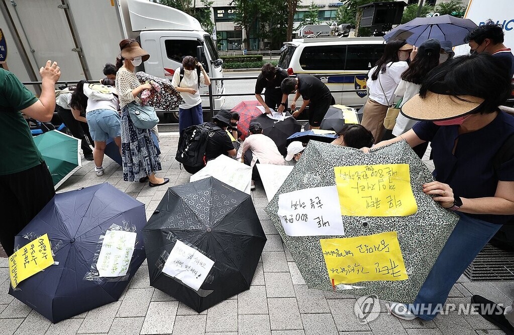 | 티몬·위메프 판매대금 정산 지연 사태가 이어지는 가운데 28일 오후 티몬·위메프의 모회사인 서울 강남구 큐텐 앞에서 피해자들이 회사 측에 빠른 환불과 대책 마련 등을 촉구하며 우산 시위를 하고 있다. (사진=연합뉴스) |