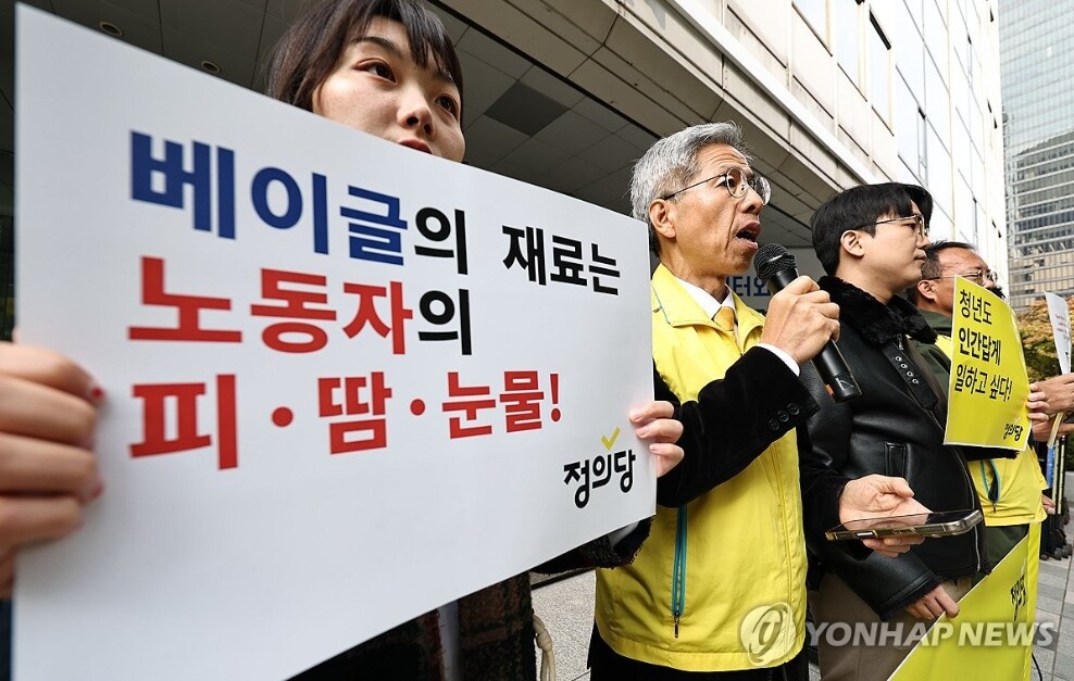 | 6일 서울 중구 서울지방고용노동청 앞에서 열린 '과로사 의혹' 런던베이글뮤지엄 사태 재발방지대책 마련 촉구 기자회견에서 정의당 관계자들이 손팻말을 들고 있다. (사진=연합뉴스) |