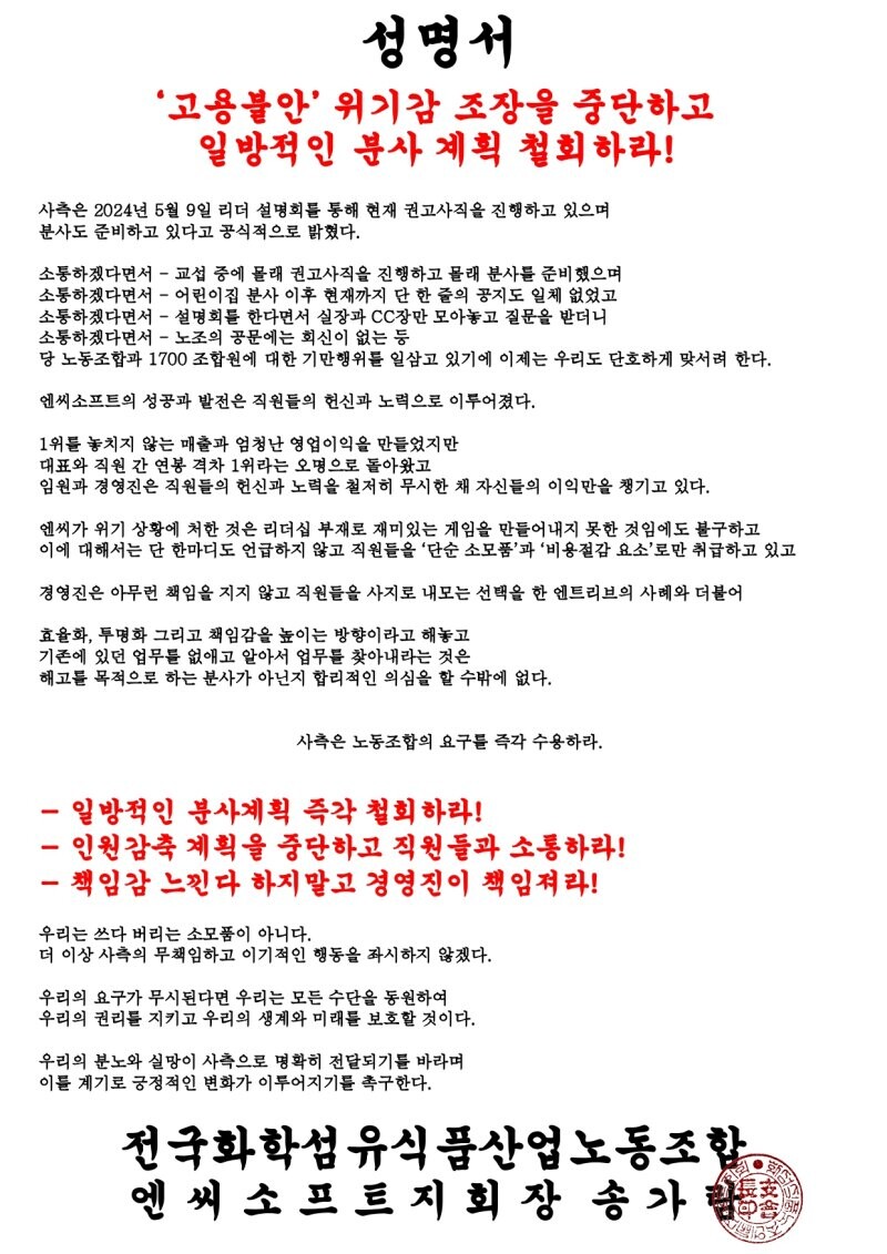[알파경제=김영택 기자] 엔씨소프트 노동조합이 사측의 위기감 조장을 통한 고용불안과 일방적인 분사계획을 철회하라고 목소리를 높이고 있다.