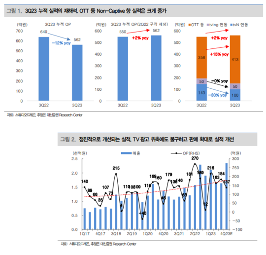 tvN 광고가 상반기 대비 개선되는 중이고, OTT와의 동시방영 및 오리지널이 많아졌으며, OTT와의 계약 갱신으로 리쿱율이 상향되면서, 부족한 회수에도 불구하고 양호한 이익이 전망된다는 평가다.
