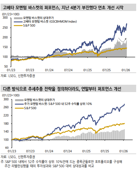 그러나 지난 4분기 고장난 것처럼 보였던 추세추종의 알파가 연초들어 급격하게 회복되고 있다. 고베타 모멘텀 바스켓은 1월에만 15% 상승해 S&P 500을 13%p 웃도는 퍼포먼스를 보여주고 있다.