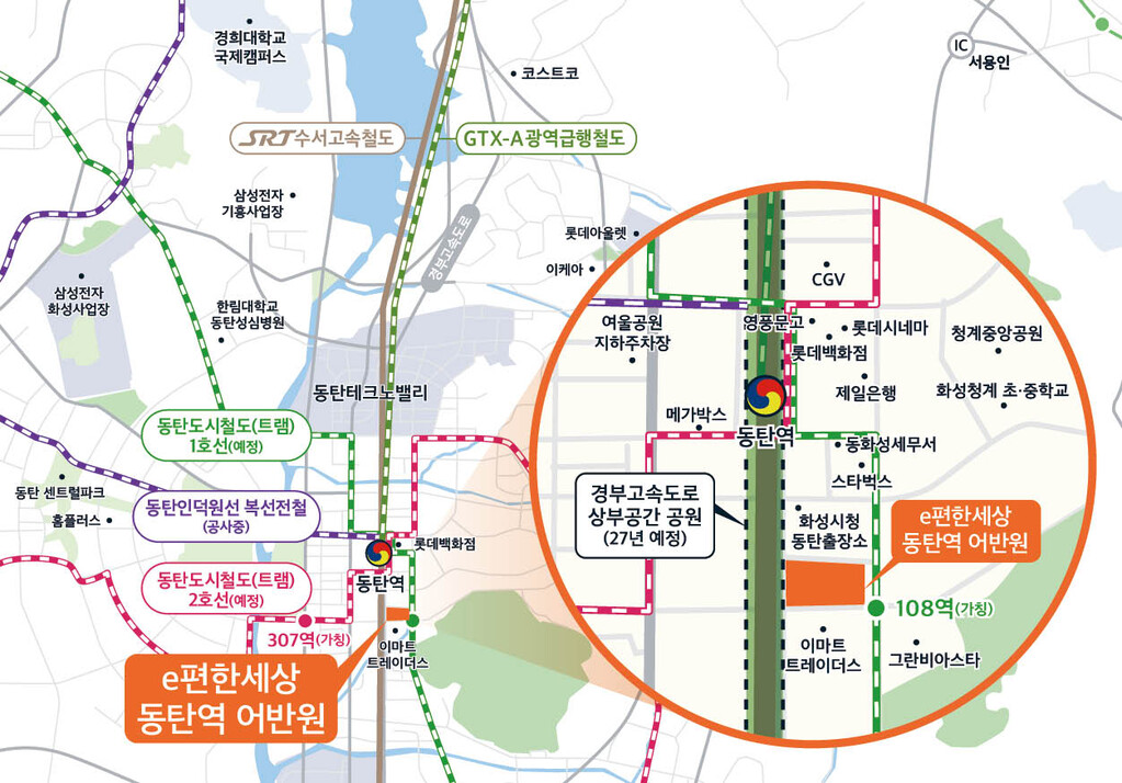 'e편한세상 동탄역 어반원'은 GTX 및 SRT 동탄역을 도보로 이용할 수 있는 역세권 단지로, 서울 출퇴근은 물론 수도권 내 다양한 지역으로의 편리한 이동이 가능하다.