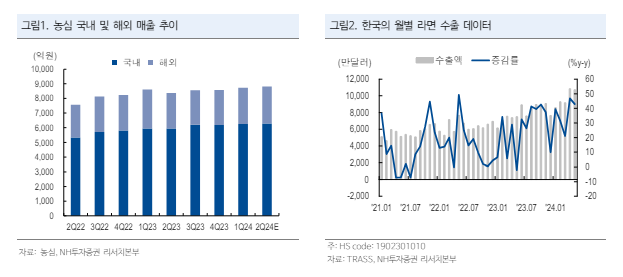 NH투자증권에 따르면, 농심의 2분기 연결기준 매출액은 8806억 원으로 전년 대비 5% 증가하고 영업이익은 518억 원으로 4% 감소할 것으로 추정된다. 일부 제품 가격 인하 영향에도 불구하고 가성비가 높은 라면의 수요가 높게 유지되고 있으며 유럽을 중심으로 한 수출 물량 또한 빠르게 증가하고 있다는 분석이다.