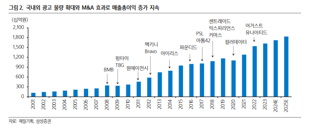 최민하 삼성증권 연구원은 "광고 경기가 완전한 회복세는 아니지만 전년 기저 효과에 더해 기존 및 신규로 개발한 비계열 광고주의 물량이 더해지면서 외형 성장 시현이 예상된다"며 "여전히 더디긴 하나 주요 광고주의 지연된 프로젝트 일부가 1분기에 실적화 되면서 수익 호전에 힘을 더한 것으로 추정된다"고 판단했다.